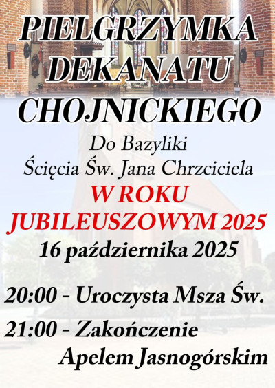 - W czwartek parafie dekanatu chojnickiego nawiedzą Bazylikę – Kościół Jubileuszowy. Wspólny wymarsz z naszego kościoła rozpoczniemy o g. 19.10. O g. 20.00 będzie sprawowana w Bazylice Msza św. Serdecznie zapraszamy do udziału, aby skorzystać z łask związanych z Rokiem Jubileuszowym, jak również uczcić osobę św. Jana Pawła II w dniu Jego wyboru na papieża.