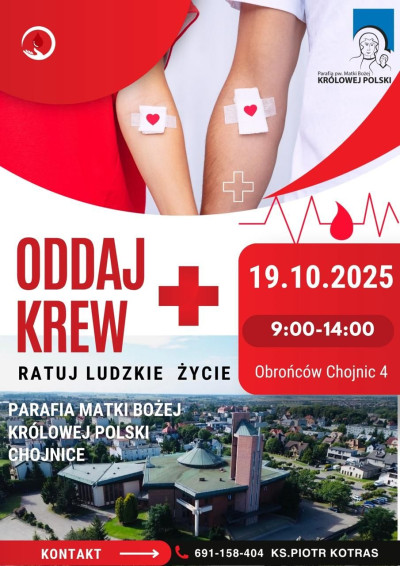 - W przyszłą niedzielę, w g. 9.00 – 14.00, w plebanii parafii Matki Bożej Królowej Polski w Chojnicach, odbędzie się akcja honorowego krwiodawstwa – oddania cząstki siebie celem ratowania zdrowia i życia bliźnich.