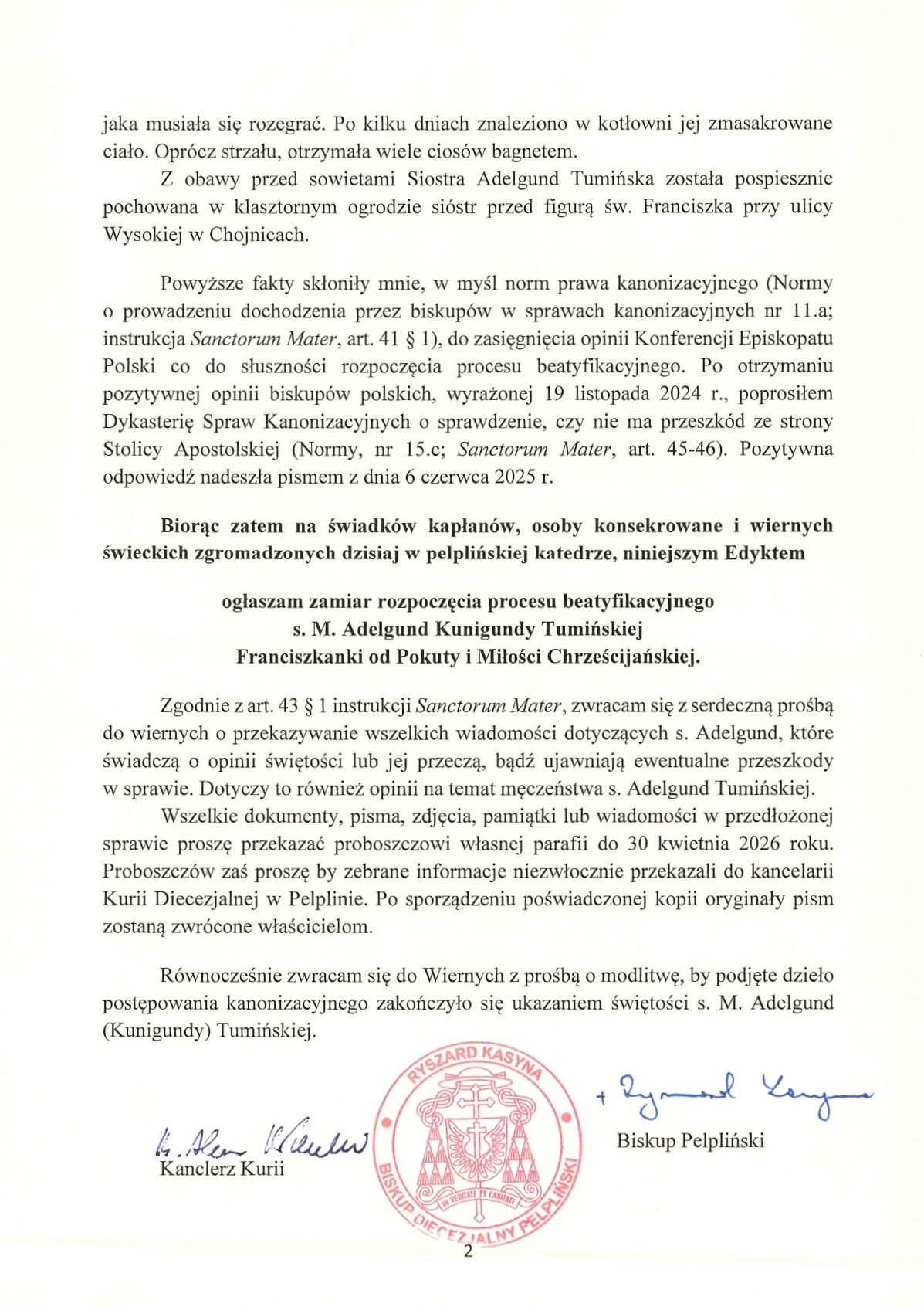 W święto Ofiarowania Pańskiego, 2 lutego 2026 r. biskup pelpliński Ryszard Kasyna wydał edykt, w którym ogłosił zamiar rozpoczęcia procesu beatyfikacyjnego s. M. Adelgund Kunigundy Tumińskiej – Franciszkanki od Pokuty i Miłości Chrześcijańskiej.